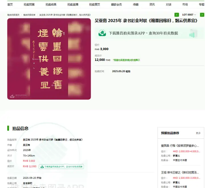 书法家吴亚南参加2025当代荟萃艺术品拍卖会作品成功落锤!