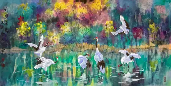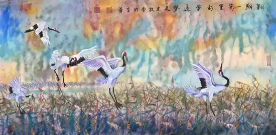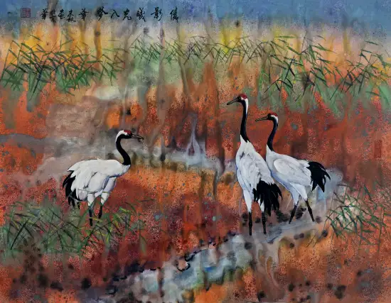在王忠权的笔下,黄山不是风景,而是天地初开的混沌与秩序。他以“墨色淋漓”的抽象肌理重构山石,以“鹤影翩跹”的意象符号点化灵性,在具象的奇松云海中,暗藏宇宙生命的律动。仙鹤不仅是祥瑞的象征,更是画家对永恒与超验的追问——如山之坚毅,如鹤之自由。