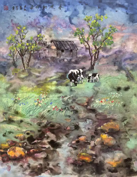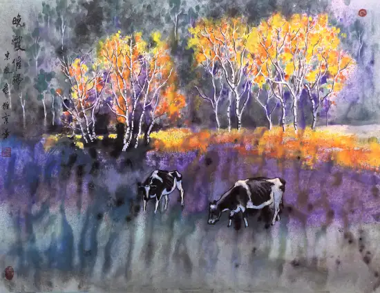 · 《莽原情·奶牛》:褪去田园牧歌的柔光,王忠权以细腻的笔触与饱满的色彩,刻画奶牛在莽原中的生命力。它们不仅是草原的住民,更是自然原始能量的化身。三象手法在此交融——具象的形体、意象的情感、抽象的荒野精神,共同编织出一曲大地颂歌。