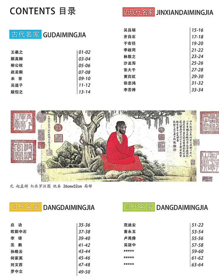 近现代名家:吴昌硕、齐白石、于右任、李叔同、林散之、沙孟海、张大千、黄宾虹、徐悲鸿、李苦禅、王雪涛、李可染、石鲁、王子武、傅抱石、何海霞、白雪石、刘文西、陆俨少、黄胄、林风眠、沙耆、钱松喦。