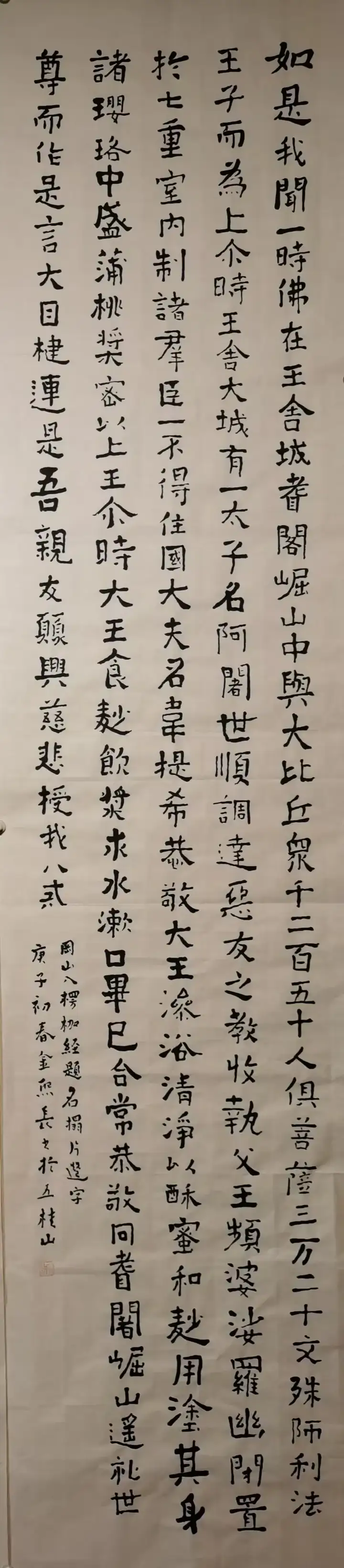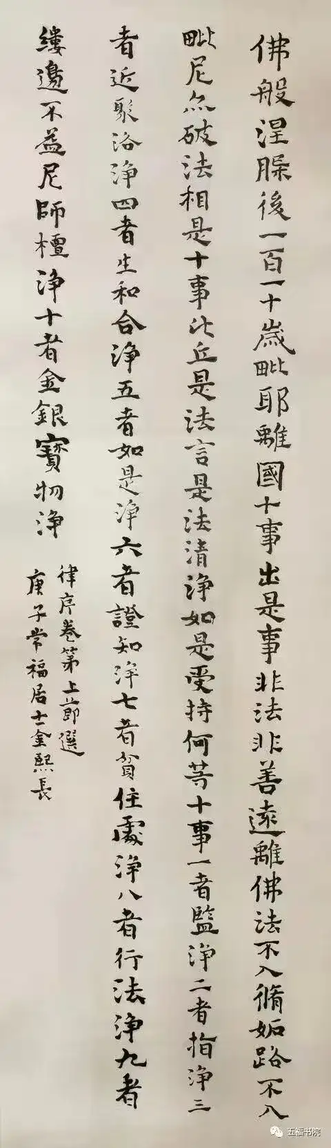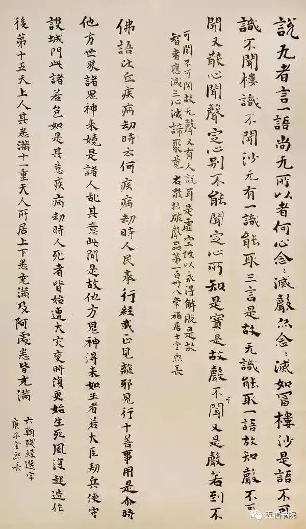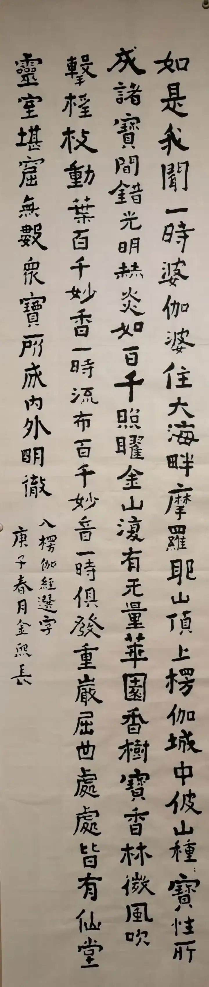 在结构处理上,他的小楷打破了唐楷“绝对对称”的桎梏,融入了汉隶的稚拙与魏碑的灵动。单个字的重心始终稳如磐石,却在细节处巧设变化:“阿”字左收右放,形成微妙的欹侧之势;“若”字撇捺舒展,如飞鸟振翅却不逾矩。这种“稳中有变”的结构哲学,让小楷既保有楷书的端庄,又多了几分自然天成的意趣,避免了程式化的僵硬。细看其书写的经文片段,字与字之间疏密相间,行与行之间顾盼呼应,整篇作品如溪水流淌般流畅,却又不失碑刻的雄浑骨力,实现了“帖学的灵动”与“碑学的厚重”的完美融合。