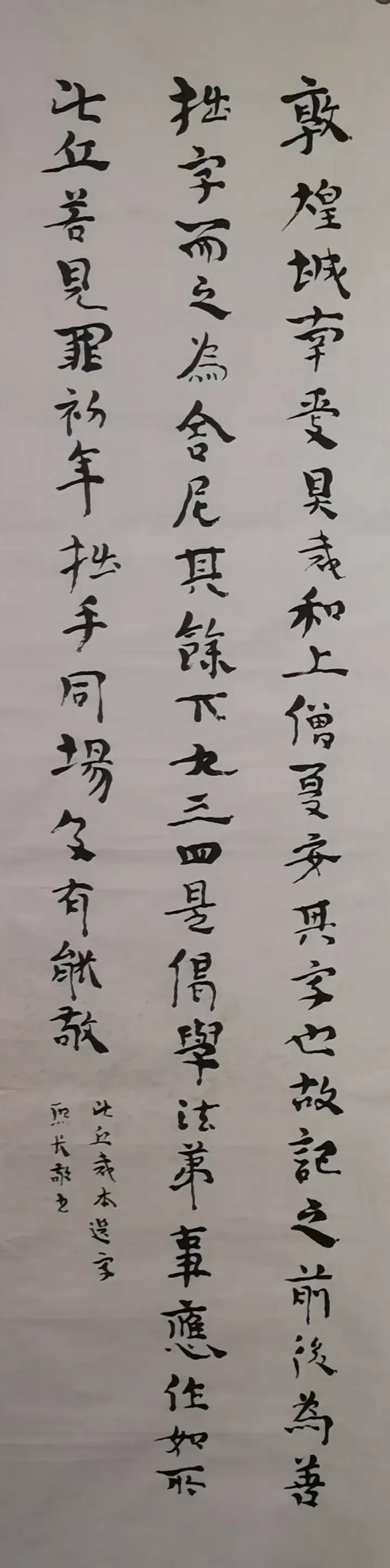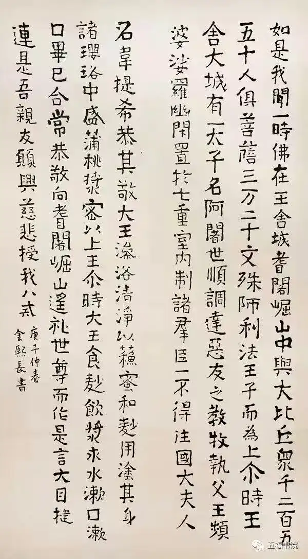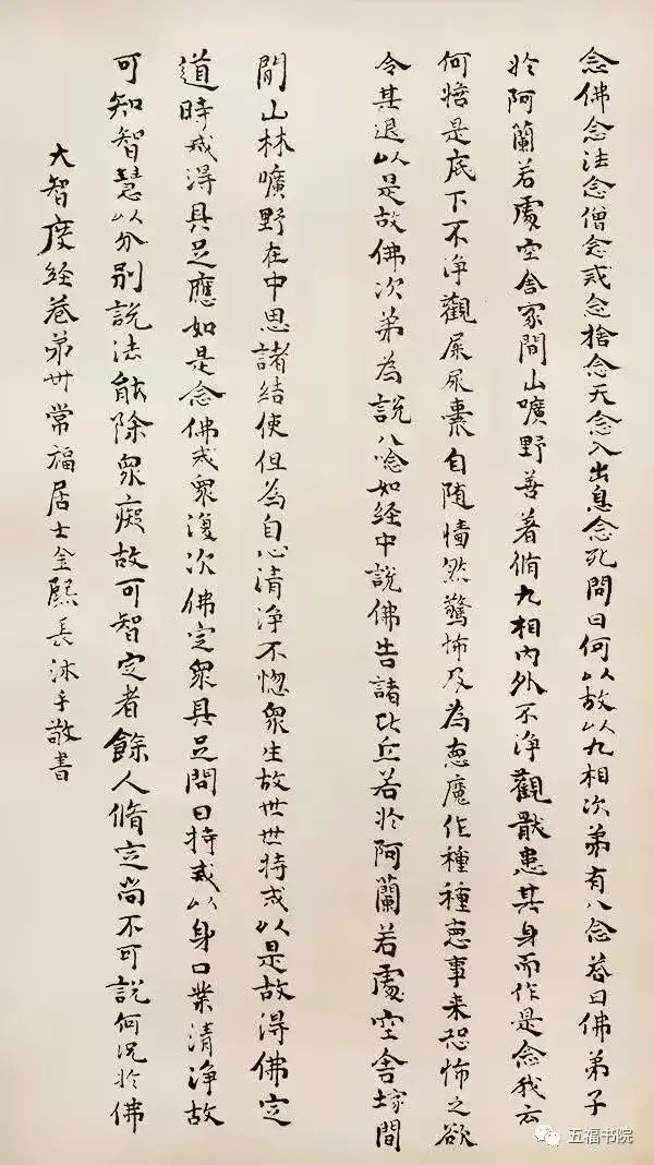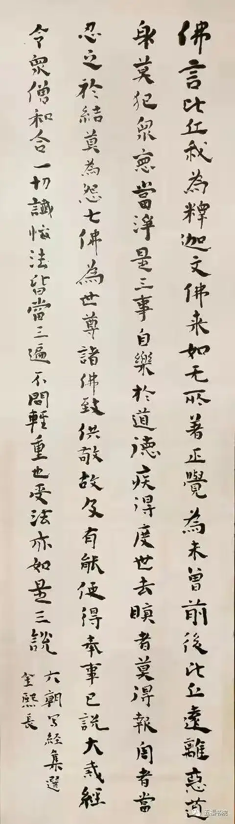在结构处理上,他的小楷打破了唐楷“绝对对称”的桎梏,融入了汉隶的稚拙与魏碑的灵动。单个字的重心始终稳如磐石,却在细节处巧设变化:“阿”字左收右放,形成微妙的欹侧之势;“若”字撇捺舒展,如飞鸟振翅却不逾矩。这种“稳中有变”的结构哲学,让小楷既保有楷书的端庄,又多了几分自然天成的意趣,避免了程式化的僵硬。细看其书写的经文片段,字与字之间疏密相间,行与行之间顾盼呼应,整篇作品如溪水流淌般流畅,却又不失碑刻的雄浑骨力,实现了“帖学的灵动”与“碑学的厚重”的完美融合。