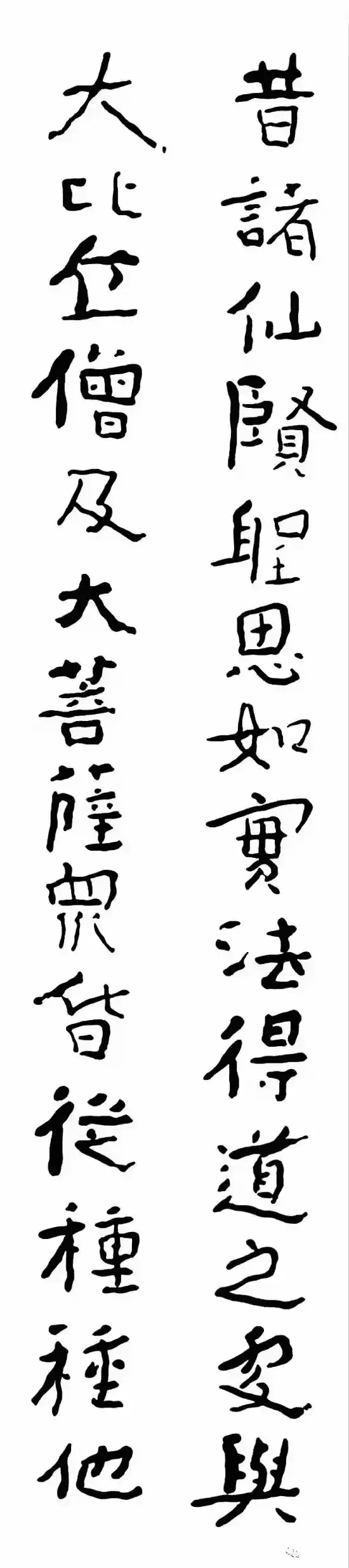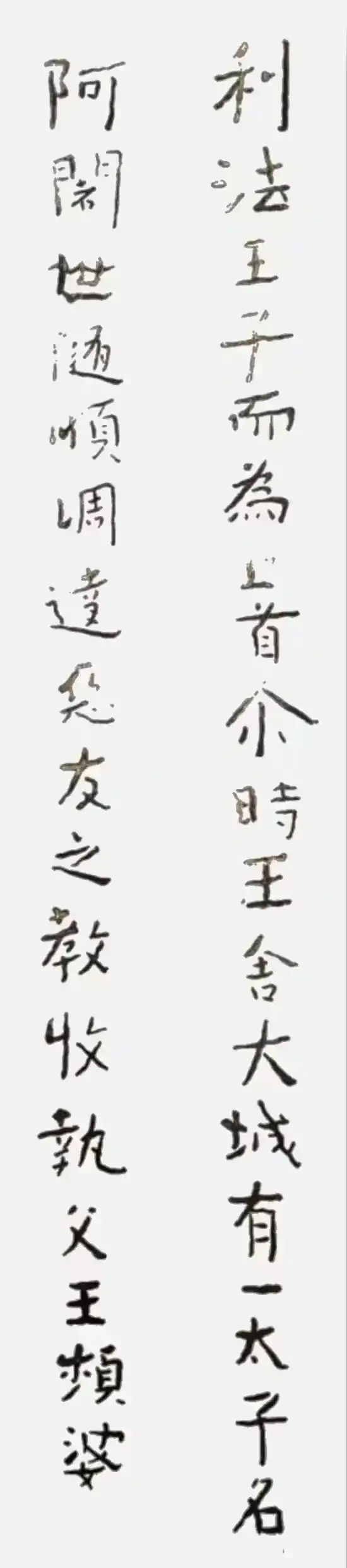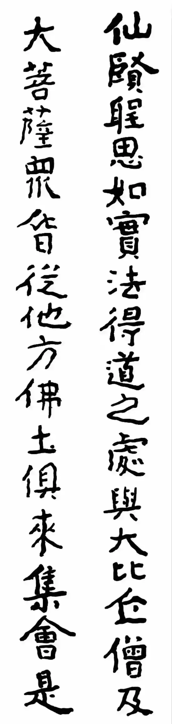 最妙的是他笔下“拙、慈、厚、悲、逸、欣”的多重意趣,不是割裂的五种书风,而是融在一幅作品里的“心性流露”。“拙”是不耍小聪明——笔画没有刻意的抖折、花哨的飞白,老老实实却见筋骨,像老农耕地,每一步都扎实;“慈厚”是笔墨的温度——横画起笔多圆笔,少方笔的锐利,竖画收笔不急促,透着包容,读来让人心里踏实;“悲”不是沉重,而是对世间的体恤——偶有笔画稍轻、稍缓,如轻叹般,却不颓丧,反而引出对“真如”的深思;“逸”是挣脱束缚的自在——长笔画不僵直,带一点自然的弧度,像山间的藤蔓,顺势生长却不杂乱;“欣”则是入世的欢喜——有些字的撇捺舒展,比如“佛”“僧”,像展开的笑靥,藏着对“欢乐人间”的珍视。这些意趣交织在一起,让《入楞伽经》的书写,既有经文的庄严,又有生活的鲜活;既见书法的技法,更见书写者的本心。