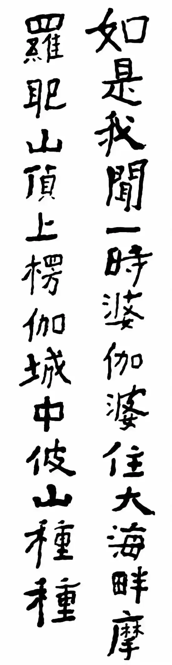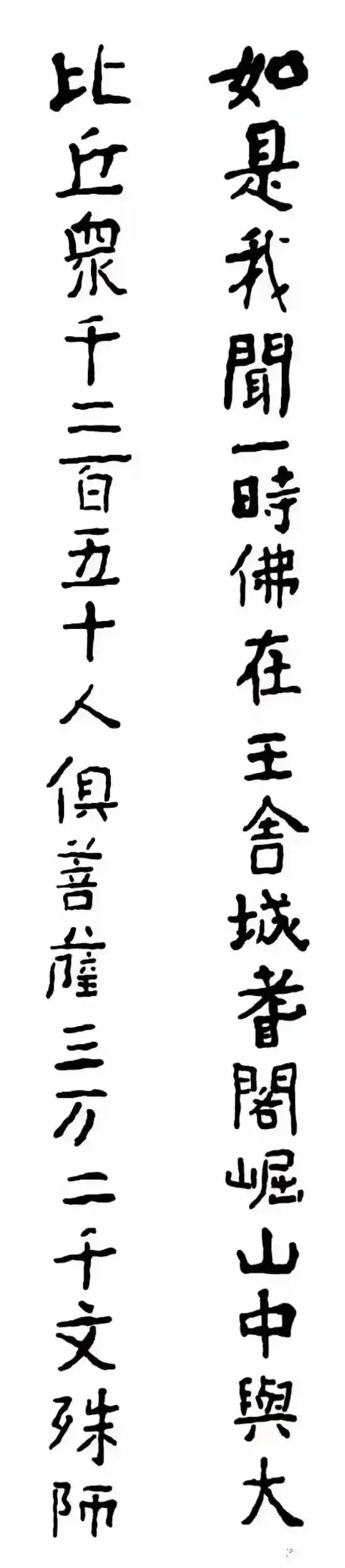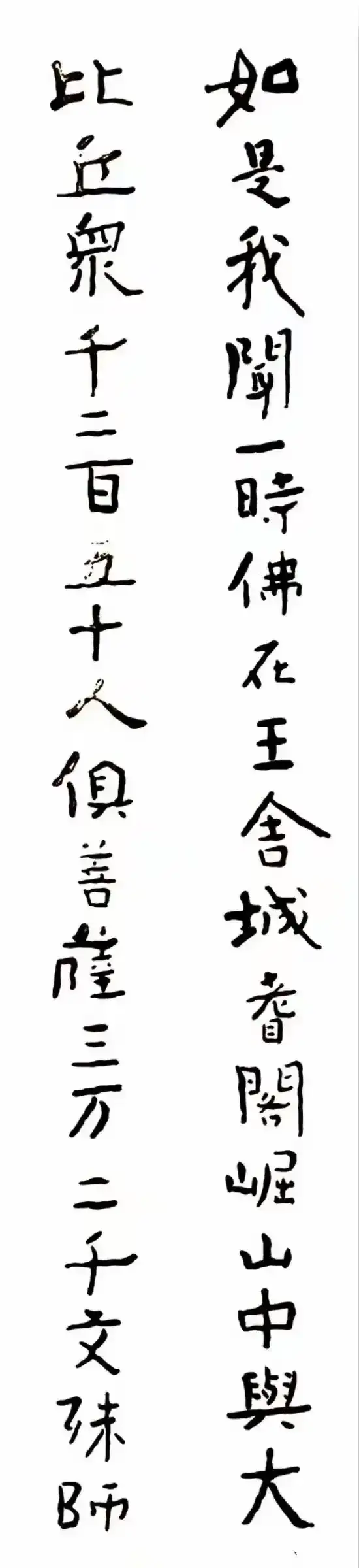 这份笔境,实则是他“出世悟理、入世证心”的心境投射。《入楞伽经》本是谈“心性修证”的经典,金熙长先生写经,不是简单的“抄经”,而是把自己对“超越”与“自在”的体悟揉进了笔墨。他从佛法里悟“挣脱羁绊”,所以笔下没有紧绷的刻意——哪怕是榜书大字,也不见蛮力,笔画的粗细变化如流水自然,该重时如石坠潭,该轻时如絮拂水;他从“心灵涅槃”里得“明了”,所以结字不求奇崛,却透着安稳——每个字都像静坐的僧人,端严却不板滞,比如“伽”“楞”等字,左右结构不挤不松,偏旁的搭配如老友对坐,温和里有默契;他最终“回到人间生活”,所以笔墨里藏着烟火气的温软——没有拒人千里的“傲气”,反而有“慈厚”的温度,看他写“如是我闻”的“闻”字,竖钩收笔不尖锐,反而带一点回锋,像与人说话时的轻声颔首,亲切又庄重。