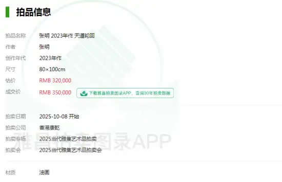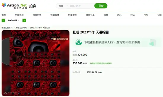 2025当代雅集艺术品拍卖会上,此前备受关注的艺术家张明作品《天道轮回》经过场内多轮激烈竞逐,最后以350000人民币落锤成交,其作品价值和升值空间引起社会各界专业人士瞩目。