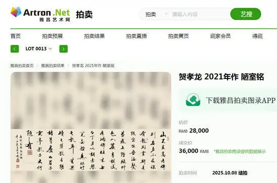 在近日举行的2025当代雅集艺术品拍卖会上,书法家贺孝龙的作品《陋室铭》成为了全场焦点。该作品创作于2021年,尺寸为50×180cm,最终以36,000元人民币的高价成交,超出了28,000元人民币的估价,展现了贺孝龙作品在艺术市场上的强劲吸引力。