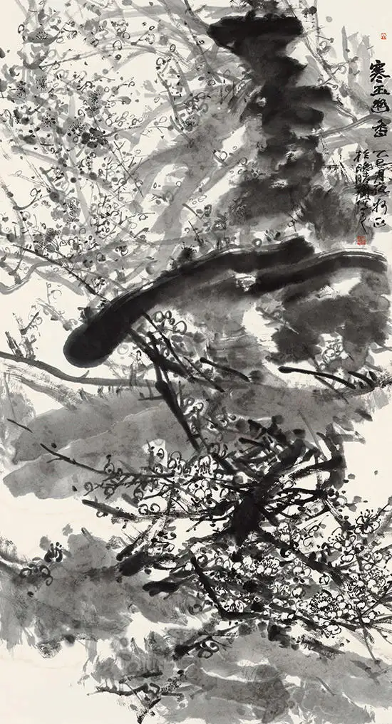 然则以上,在解读妙正创作之中所蕴含、隐依的“禅思”“禅念”,这种精神的意绪之外,观照具体的笔墨这一外在的形式,也是颇为重要的。如果说,“禅”是“形而上”的,它摸不到,视不见;那么,“笔墨”是实实在在能感触到的,它渗透于“纸”中,而进激到人的感官。妙正屡辗转于中央美术学院与中国美术学院,求师研学,苦修技能。他深谙中国传统艺术之所以发扬广大,基本的前提在于“一脉相承”。于是,他远承明之青藤、白阳,及清之八大、石涛,近接蒲华、缶翁,甚至现代的齐白石,等等,所尚既高,寓兴即雅。故凡作画,咸能曲尽其态,妙比造化。譬如,他赴河西走廊,访索寺庙、石窟遗存,当也是探求源头,身体力行的一种修炼与实践。