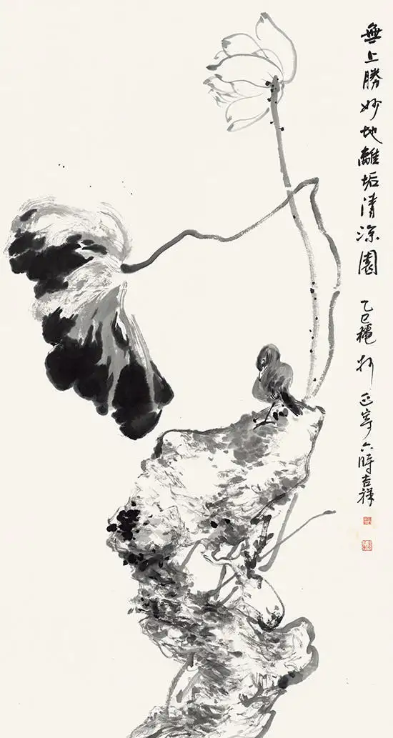 吴敬梓《儒林外史》第一回《说楔子敷陈大义 借名流隐括全文》叙述了以画“墨梅”著称的元王冕画荷的场景——胭脂铅粉,与“那荷花精神颜色无一不像”。元章所绘无疑是一幅设色荷图。这无让人想起宋之赵昌。他喜画折枝花卉,自号“写生赵昌”,不用墨线勾勒,施之颜色,世谓“没骨法”。然自苏轼提出“论画以形似,见与儿童邻”(《书鄢陵王主簿所画折枝》),直到明一代,陈淳、徐渭的异军突起,一种崭新的水墨风格展现在了世人面前。妙正的荷图如前及继承了青藤、白阳之一宗,再渗入朱耷的疏佚、率意,渐形成自家面目。因此,妙正的荷图迥然有别于宋元时期画人(院画)的精工、细致、纤秾;不拘形似,漫不经心,信手拈来,处处隐匿着手段和深机。诸如,水墨之于阔笔的挥洒铺染,叶面的线条或空勾,或复勾,虚虚实实,清润四溢,风神洒落,别样生动。令人看上去虽是一片“物质”(真实)的荷图,然更呈现出的是一种“精神”(气韵)的莲世界。