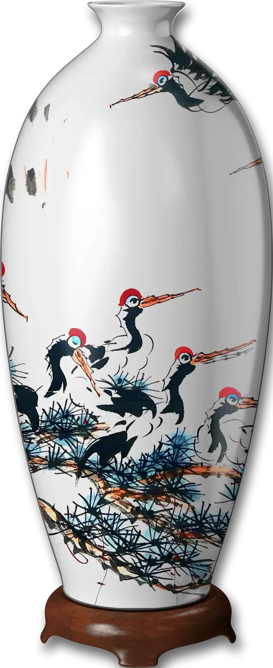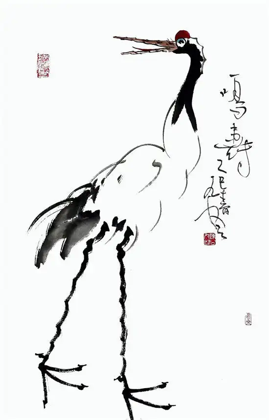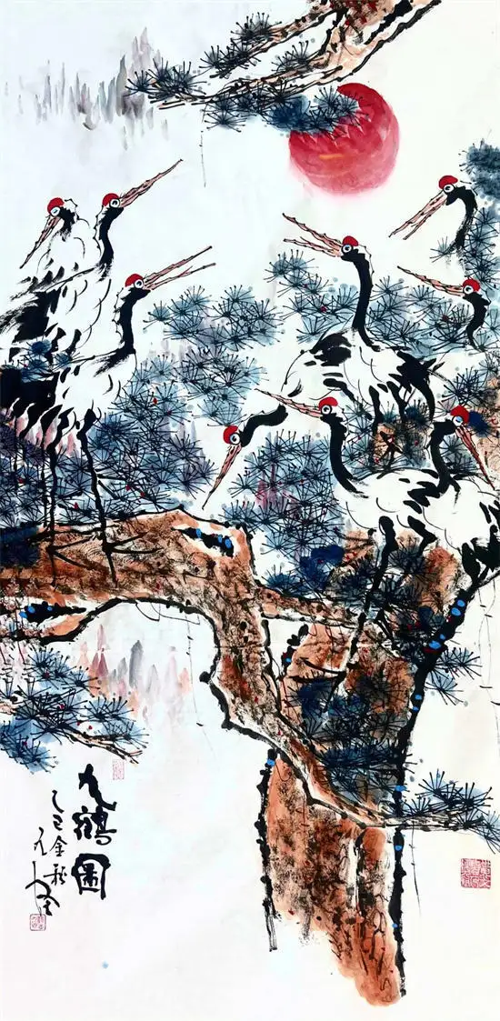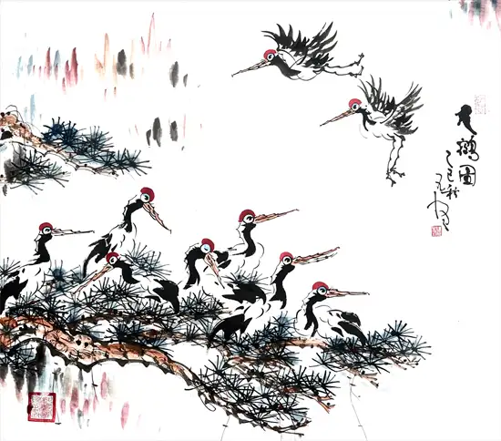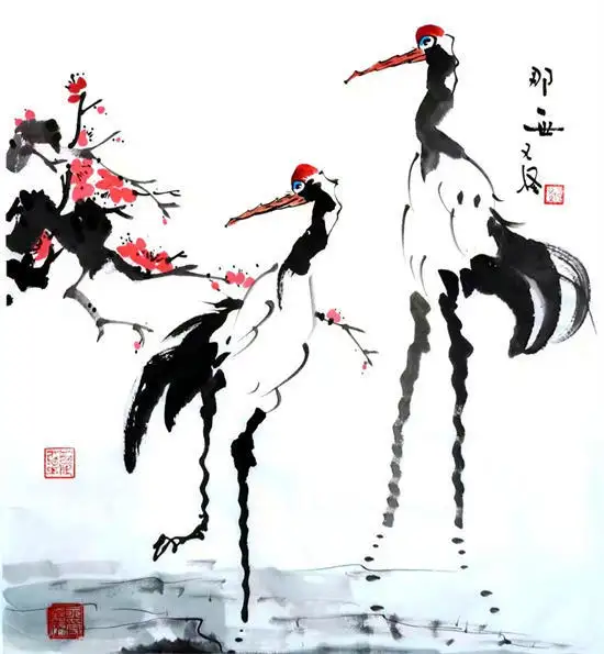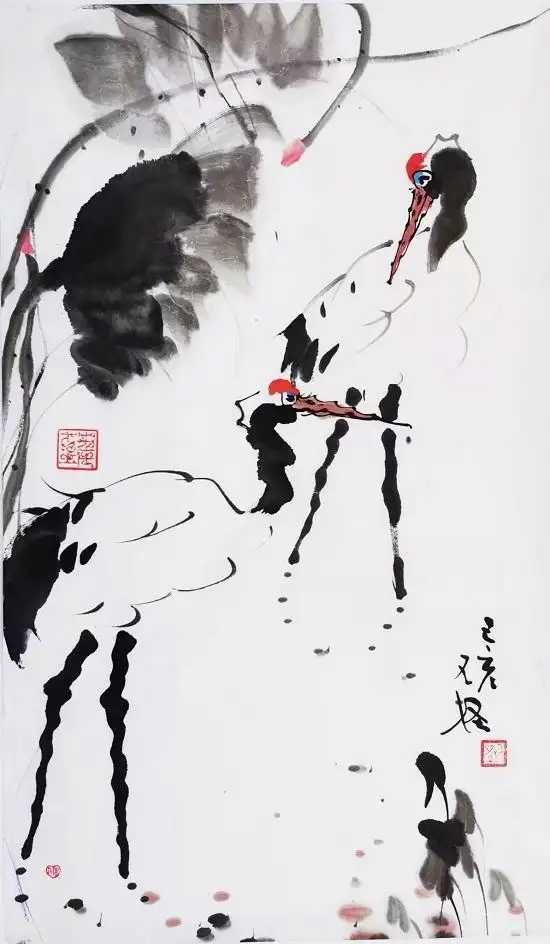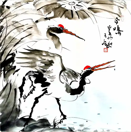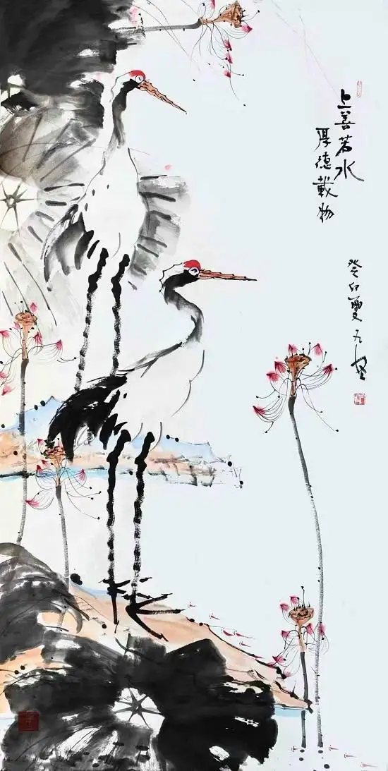 陈九怪参拍作品《丹顶鹤国画·上善若水厚德载物》