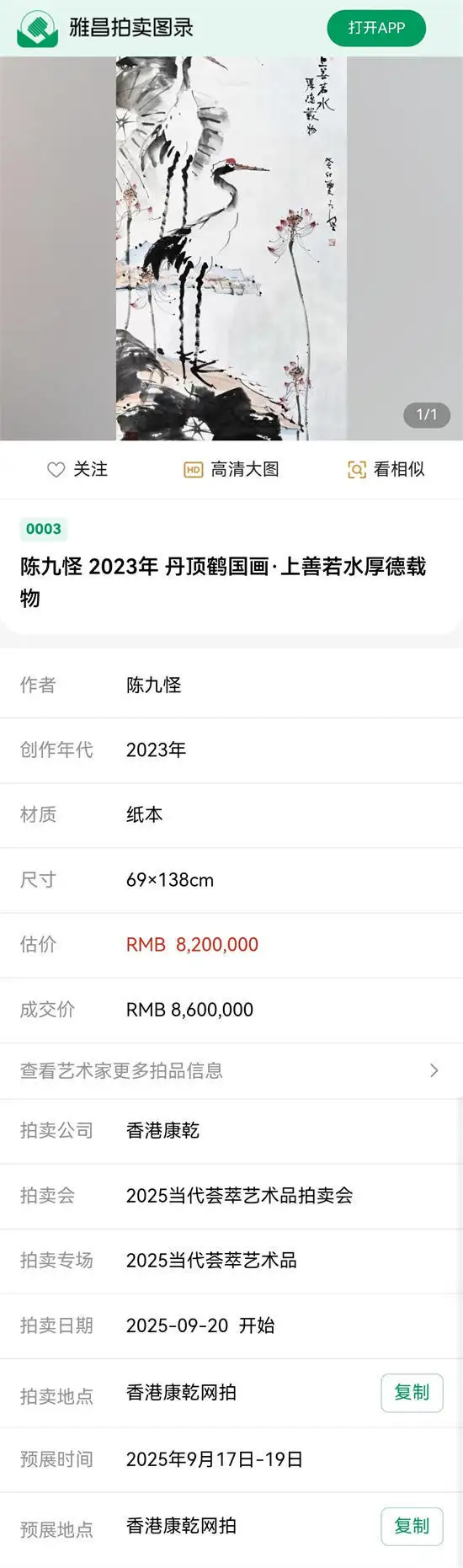 香港康乾拍卖公司在2025年9月20日举行的2025当代荟萃艺术品拍卖会中,备受关注的艺术家陈九怪作品《丹顶鹤国画·上善若水厚德载物》经场内多轮激烈竞逐,最后以860万元落槌成交,其作品价值和升值空间引起社会各界专业人士瞩目。