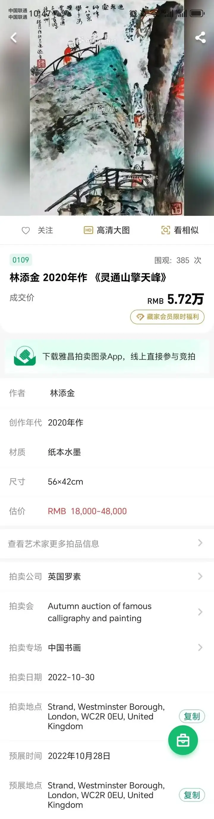 2022年10月30日林添金作品《灵通山擎天峰》经多轮激烈竞逐,以人民币57200元落锤成交。
