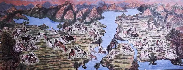 画面以层叠山峦为背景,蜿蜒溪流如血脉贯穿其中,各类动物或群居、或独处,在山林间形成有机的生命网络。猛兽与萌宠同框却无丝毫违和,飞禽与走兽共处尽显自然和谐——这种看似“混搭”的构图,实则是对“万物共生”理念的精妙解构。画家以全景式的布局,将天、地、生灵纳入同一维度,暗示着所有生命在自然体系中相互依存的本质,让观者在欣赏画面的同时,不自觉地叩问人与自然的关系。
