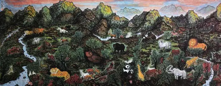 在这幅画里,每一只动物都不是冰冷的“物象”,而是有灵的生命个体。熊猫的憨态、大象的温厚、老虎的雄健……画家通过细腻的笔触,捕捉到不同物种的神态特质,让它们的“性格”跃然纸上。这种对生命个体的尊重与描摹,传递出深沉的生命敬畏感。它不仅是一幅描绘自然的画作,更是一次对“共生”精神的艺术宣言——在这片由丹青构筑的天地里,所有生命都拥有平等的呼吸权,而人类对自然的凝望,最终也将落于对自身与万物关系的深刻反思。