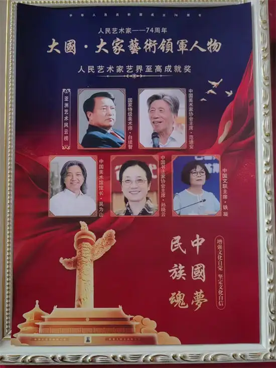 2014 年荣获中国文化部授予的书画艺术泰斗称号;2019 年建国七十周年艺术展作品评为特等奖;九月获得中宣部颁发的“中华艺术国家功勋人物”奖;2020年获得全国学雷锋先进个人荣誉称号:同年获中共中央宣传部颁发的“时代楷模人物奖",同年荣获书法最高荣誉奖“兰亭·终身成就奖";被中国文联党组授予“艺术楷模人物”称号:同年11 月同联合国常任理事国六位书画家荣获大国艺术工匠功勋人物奖;2022 年获欧盟 27国骑士勋章奖;2023年获金砖五国艺术家代表;同年获中国唯一联合国非遗贡献奖全国贡献突出专家奖;2024 年获毕加索国际杰出贡献奖,同年获奥林匹克东方艺术大师称号。