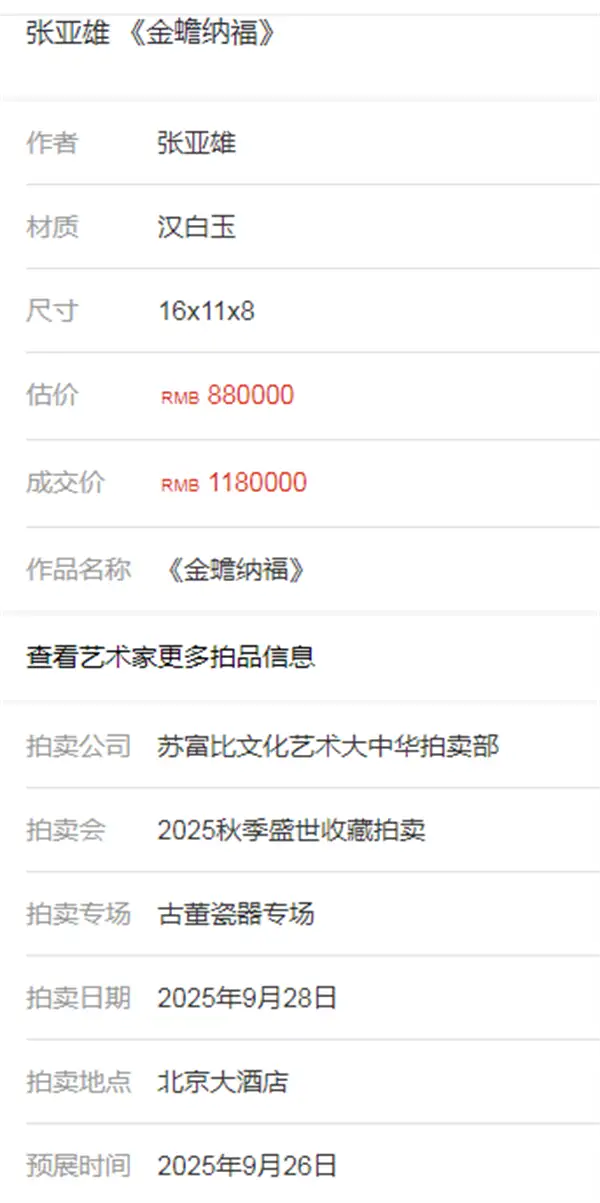 在2025年苏富比秋季盛世收藏拍卖会上,一件由艺术家张亚雄创作的汉白玉雕刻《金蟾纳福》以估价88万元人民币起拍,最终以118万元人民币的成交价,在古董瓷器专场中掀起了一阵关于玉石雕刻艺术价值与市场潜力的热议。这件尺寸为:长16cm×宽11cm×高8cm的艺术作品,不仅是材质与工艺的结晶,更是传统文化符号在当代艺术市场中的一次精彩绽放。