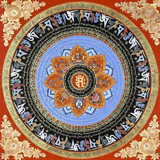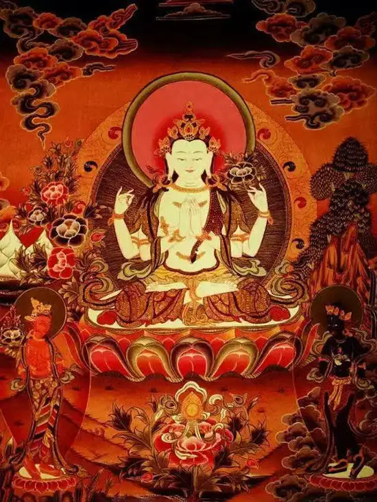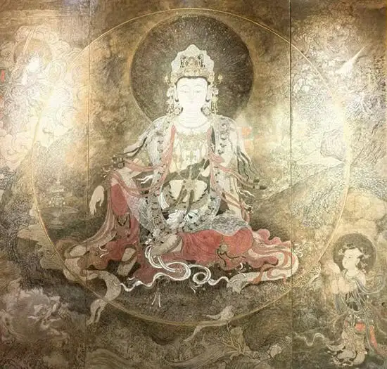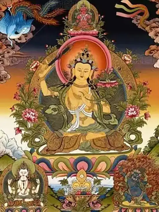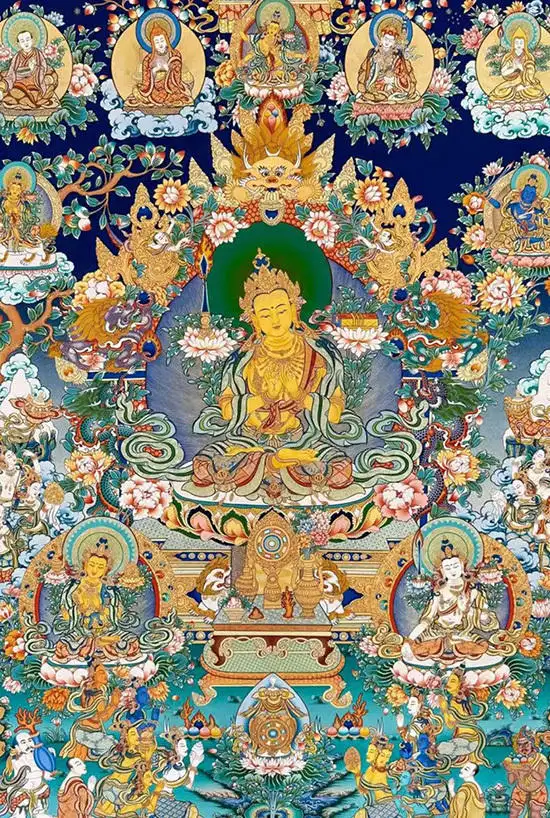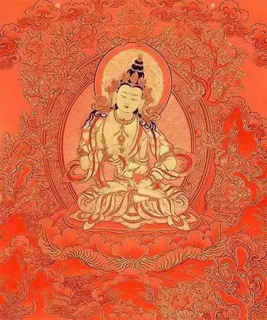 在艺术表现上,张墨伦对重彩技法的运用堪称精妙。他承袭传统工笔重彩“富丽庄重”的特质,选用天然矿物与植物颜料,通过层层罩染、积染的技法,让色彩既厚重饱满,又通透灵动。金色象征佛法的神圣庄严,红色蕴含慈悲温暖,蓝色隐喻空性宁静,色彩的搭配既符合佛教艺术的审美传统,又与佛学义理相呼应。同时,他巧妙融入现代审美意识,注重画面的空间感与层次感,让佛像在简洁背景的衬托下更显精神张力,使传统佛画在当代语境中焕发出新的生命力。