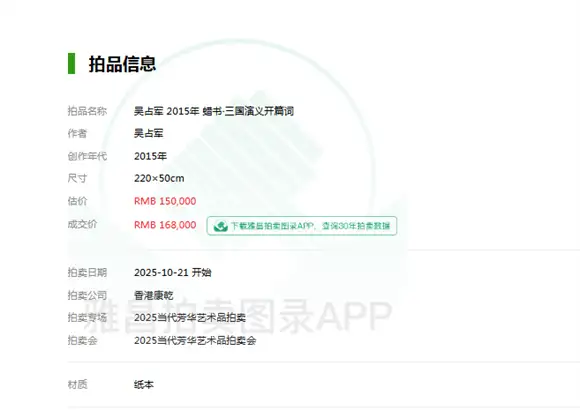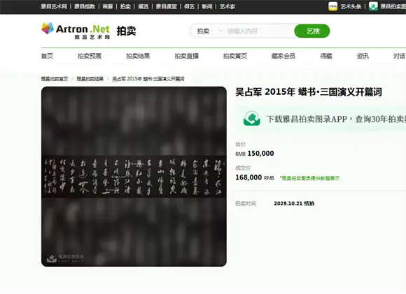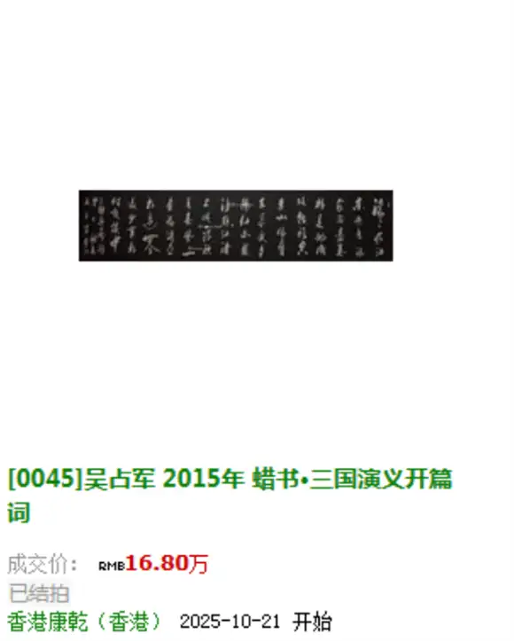 在2025年10月21日,由香港康乾拍卖有限公司主办的2025年当代风华艺术品拍卖会活动庆典现场,此前备受关注的吴占军老师蜡书作品《三国演义开篇词》经多轮激烈竞逐,以168000元高价落槌成交,从各项标准来看,能上雅昌拍卖艺术榜的艺术家,均是得到过市场检验过的艺术家,要具备较高的资历,艺术作品和艺术地位得到业界的广泛认可,在艺术市场起到带动引领的作用。