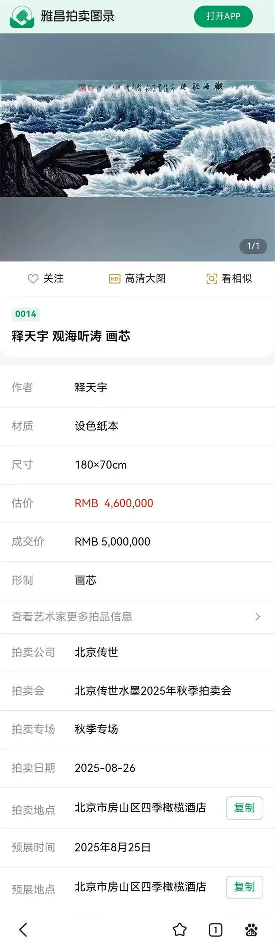 北京传世拍卖公司在2025年8月26日举行的北京传世水墨2025年秋季拍卖会中,备受关注的艺术家释天宇作品《观海听涛》经场内多轮激烈竞逐,最后以500万元落槌成交,其作品价值和升值空间引起社会各界专业人士瞩目。